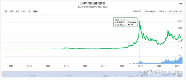 比特币十年生死两茫茫,既暴涨,也暴跌。循循环环有赚有亏。既然是循环,用哲学辩证的角度去看待这个结果。多的我也记不住,我就记得上学时的对立统一论,从对立中把握统一,从统一中把握对立。避免形而上学思想方法的绝对化和片面性。说句人话,市场亏的时候进场,就可以把赚钱放在对立面。什么时候是亏的,上一篇文章我也说得很清楚的,预测的结果没看过的翻上去看看吧。就是现在这个时候,天时地利人和分而论。天时:比特币要减产,矿工头疼,抛压大。疫情四起,举国防,皆庇护,此期间通货紧缩。物品贬值。 地利:矿场今年招商头疼电价一降再降。 人和:炒币的人和矿工的人不知去哪了,消失了。综其上,市场大伤,为进场时期。比特币最高光辉两万美元时刻,市值高达2.8万亿。疯狂之后的醒悟不再提起。后面的价格很明显开始走出2017年的无人问津画图了。有上有下成为市场投资的热门产品了,热度还在,争议不停,市场就还会在