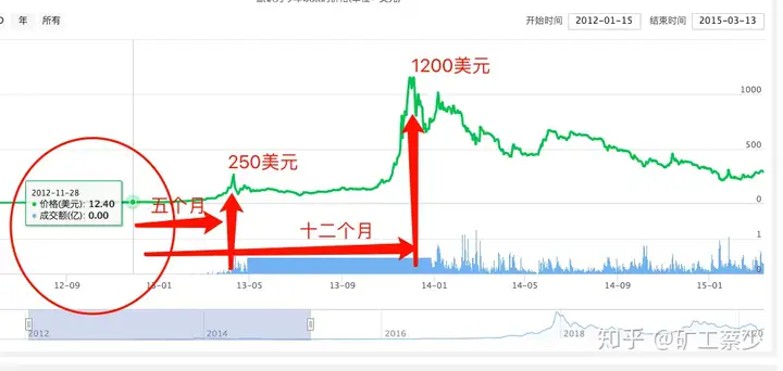第一次减产没什么人关注,毕竟12年能知道比特币的就没几个。所以五个月的时间翻20倍,一年的时间翻100倍。有图有真相