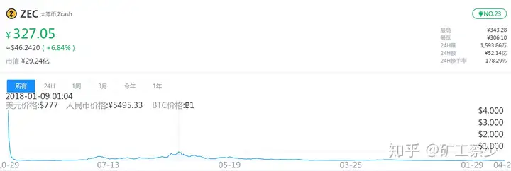 咱们再来看看大零币的一个挖矿情况。总量和比特币一样是2100万枚。挖出来了700万个*328块一个币=29亿左右的市值。卧槽,感觉这个市场的潜力无限大啊。去年的排名记忆犹新50名左右。现在位居数字货币排名23名。