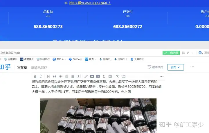 那么接下来见的就是挖大零币的一个挖矿情况了。本人是大零币的贴吧吧主,如果对于大零币感兴趣的话也可以去关注下贴吧广交天下寒食俱欢颜。去年也是买了一堆挖大零币矿机的Z11。情况比挖比特币好太多。机器算力稳定,没什么故障。币价从300涨到700。回本时间大概半年,入手价格1.1万。回本后全部售出每台均8000左右。先上图