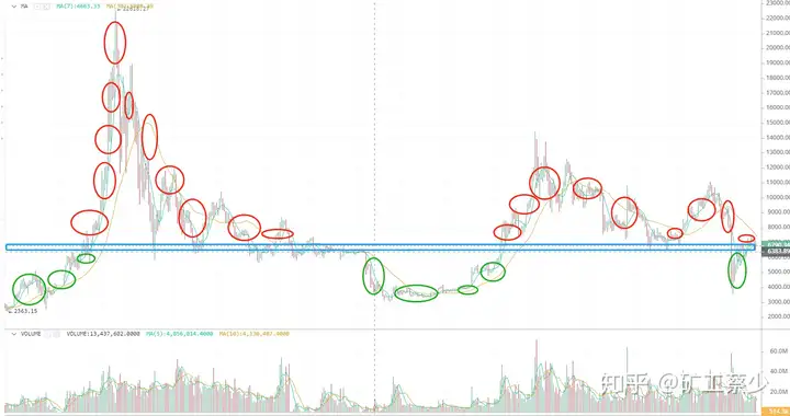 简单粗暴的圈圈理论。就拿2017年-2020年目前的比特币价格分析。有百分80的圈圈都是站在6000美元以上。比特币第一次处于6000美元以下是2018年头市场热情褪去,历经半年时间拉回。第二次是犹豫疫情四起全球金融资产暴跌而处于6000美元下,但是迅速拉回。所以整体上比特币的价值基本公认于6000美元以上一枚。低于这个价格,身边就会有很多人进场。按这个比例分部来看。加上次这一次的暴跌为减产后的暴涨埋下了一个低成本拉盘的准备。这次减产还是看涨。因为红色圈圈比较多,比特币的经常活动区域,比特币喜欢去的地方就是大方向。