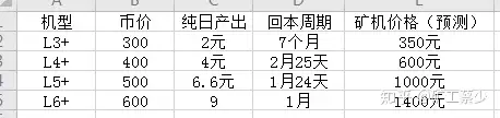 这里做一个简单的分析判断。若币价涨的情况下,回本周期时间就意味着您屯的币的时间达到了。 币价也如图达到了。那么上面将大概会是您的一个回本周期。跌到200元一个莱特币就不说了就直接关机了。那么矿机价格预测是根据回本周期以及市场的多年经验来预测的。打个比喻。您当时花350买的L3+。现在莱特币涨到500的价格了,机器回本只要1个月,就算是二手的你还可以挖的一年半载不夸张。这个时候我让你350卖给我你愿意吗。出到1000的价格。以这个价格买入的机器回本周期大概是六七个月,就符合市场价了。经营所得。莱特币的情况一笔带过。大家可以看看上一篇文章的详情。